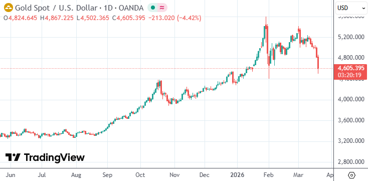 日内,美国WTI原油价格升破每桶100美元。分析称,能源成本上升可能推高通胀,使各国央行更难降息,从而对黄金构成压力。自中东战事爆发以来,现货黄金已累计下跌约13%。