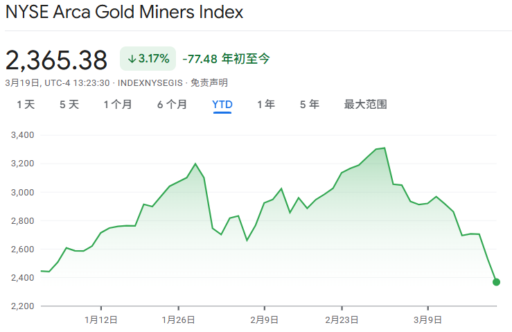 周四(3月19日)美股盘中,纽约证券交易所Arca黄金矿业指数(NYSE Arca Gold Miners Index,代码:GDM)一度跌10%,创去年12月以来的最低水平。